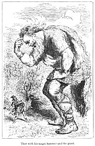 Then he put iron into the fire, and bid him blow, and said that if he stopped blowing all the work would be lost. The fly now settled between his eyes, and bit so hard that the blood ran into his eyes, so that he could not see; so when the bellows were down be caught at the fly in all haste, and tore off its wings; but then came the smith, and said that all that was in the fire had nearly been spoiled. He then took out of the fire the hammer Miölner, [c] gave all the things to his brother Brock, and bade him go with them to Asgard and settle the wager.