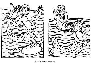 The Bretons also believe in Mermaids; they name them Morgan (sea-women) and Morverc'h (sea-daughters), and say that they draw down to their palaces of gold and crystal at the bottom of the sea or of ponds, those who venture imprudently too neat the edge of the water. Like the mermaids they sing and comb their golden hair. In one of the ballads we read, "Fisher, hast thou seen the mermaid combing her hair, yellow as gold, by the noontide sun, at the edge of the water?" "I have seen the fair mermaid. I have also heard her singing; her, songs were plaintive as the waves." [n]