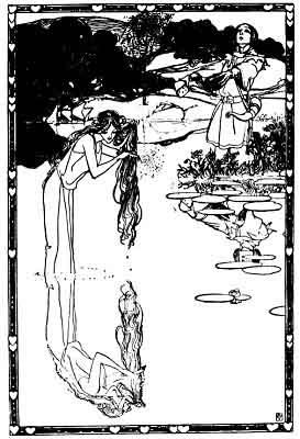 He was protesting that he would rather cut off his hand than employ it in such a way, when she suddenly darted from him and dived into the lake. His grief and disappointment was so sore that he determined to put an end to his life by casting himself headlong into the deepest water of the lake. He rushed to the top of a great rock overhanging the water, and was on the point of jumping in when he heard a loud voice saying, "Forbear, rash youth, and come hither."