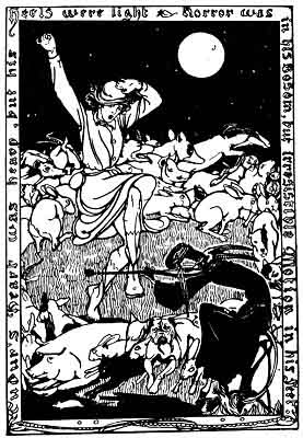 No sooner were these words uttered than everything underwent a change. The gorse-blossom cap vanished from the minstrel's head, and a pair of goat's horns branched out instead. His face became as black as soot: a long tail grew out of his leafy coat and cloven hoofs replaced the beetle-wing pumps. Tudur's heart was heavy, but his heels were light. Horror was in his bosom, but irresistible motion was in his feet. The fairies changed into a variety of forms. Some became goats and some became dogs, some assumed the shape of foxes and others that of cats. It was the strangest crew that ever surrounded a human being. The dance became at last so furious that Tudur could not make out the forms of the dancers. They whirled round him with such rapidity that they resembled a wheel of fire. Tudur danced on and on. He could not stop, for the devil's music was too much for him, as the figure with the goat's horns poured it out of the strings of his fiddle with unceasing vigour. It went on thus throughout the night.