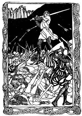 At first the men of the Vale rushed carelessly upon the men of Ardudwy, thinking that it was but a light task to overpower the little band, but so many of them fell that they drew off to order their attack better. They carefully marshalled the bravest of their number and charged; a desperate hand-to-hand struggle followed, but the men of Ardudwy, though they lost many good men, at last beat off the assault. They now feigned flight, but as the men of the Vale came on with wild cries and uproar, they wheeled round and cut down so many of them that they fled in disorder. They soon rallied, however, and delivered charge after charge. Time after time the men of Ardudwy flung them back, but they became fewer and fewer with each charge.
