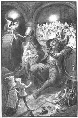 Our story has especially to do with the adventures of one of the party, John Sturtridge, who, well primed with ale, started on his homeward way for Luxulyan Church-town. John had got as far as Tregarden Down without any mishap worth recording, when, alas I he happed upon a party of the little people, who were at their sports in the shelter of a huge granite boulder. Assailed by shouts of derisive laughter, he hastened on frightened and bewildered, but the Down, well known from early experience, became like ground untrodden, and after long trial no gate or stile was to be found. He was getting vexed, as well as puzzled, when a chorus of tiny voices shouted: "Ho I and away for Par Beach!" John repeated the shout, and was in an instant caught up, and in a twinkling found himself on the sands of Par. A brief dance, and the cry was given: "Ho! and away for Squire Tremain's cellar!" A repetition of the Piskie cry found John with his elfish companions in the cellars at Heligan, where was beer and wine galore. It need not be said that he availed himself of his opportunities. The mixture of all the good liquors so affected him that, alas! he forgot in time to catch up the next cry of "Ho! and away for Par Beach!" In the morning John was found by the butler, groping and tumbling among butts and barrels, very much muddled with the squire's good drink. His strange story, very incoherently told, was not credited by the squire, who committed him to jail for the burglary, and in due time he was convicted and sentenced to death.