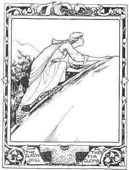 Long she sat, and aye she wept, till she wearied. At last she rose and went away, she didn't know where. On she wandered, till she came to a great hill of glass, that she tried all she could to climb, but wasn't able. Round the bottom of the hill she went, sobbing and seeking a passage over, till at last she came to a smith's house; and the smith promised, if she would serve him seven years, he would make her iron shoon, wherewith she could climb over the glassy hill. At seven years' end she got her iron shoon, clomb the glassy hill, and chanced to come to the old washerwife's habitation. There she was told of a gallant young knight that had given in some clothes all over blood to wash, and whoever washed them was to be his wife. The old wife had washed till she was tired, and then she set her daughter at it, and both washed, and they washed, and they washed, in hopes of getting the young knight; but for all they could do they couldn't bring out a stain. At length they set the stranger damsel to work; and whenever she began, the stains came out pure and clean, and the old wife made the knight believe it was her daughter had washed the clothes. So the knight and the eldest daughter were to be married, and the stranger damsel was distracted at the thought of it, for she was deeply in love with him. So she bethought her of her apple, and breaking it, found it filled with gold and precious jewellery, the richest she had ever seen. 'All these,' she said to the eldest daughter, 'I will give you, on condition that you put off your marriage for one day, and allow me to go into his room alone at night.' The lady consented; but meanwhile the old wife had prepared a sleeping drink, and given it to the knight, who drank it, and never wakened till next morning. The livelong night the damsel sobbed and sang: