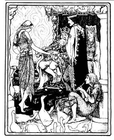 Before he had finished speaking, the herdboy put his pipe to his lips and played a few low notes that sounded like a bird singing far off in the woods; and as he played, Tattercoats's rags were changed to shining robes sewn with glittering jewels, a golden crown lay upon her golden hair, and the flock of geese behind her became a crowd of dainty pages, bearing her long train.