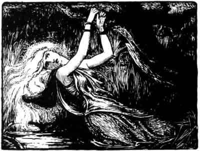 Sure enough, at the month's end down she stept, wrapped up in a black cloak, and a black hood over her yellow shining hair. Straight she went to the bog edge and looked about her. Water here and water there; waving tussocks and trembling mools, and great black snags all twisted and bent. Before her all was dark -- dark but for the glimmer of the stars in the pools, and the light that came from her own white feet, stealing out of her black cloak.