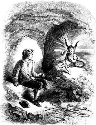 Whilst he thus sat deploring his hard lot, all at once he saw a bright and greenish light stream upon the opposite side of the rock; and, on looking up, beheld with surprise the queerest little boy he had ever seen. He was very low in stature, but such limbs! they seemed to be composed of rolls of fat; with a face like a ball, and so full and red, with a nose as round as a bottle; whilst the eyes, that were small, gleamed out of his head like a couple of bright burning coals in a blacksmith's forge. He had very large ears, hairy and long, resembling those of a donkey, and a tail that he twirled and twisted about, and at last rested the end of it, which was full and bushy, upon his shoulder. He carried a hammer in his little fat hand, and was as naked as when he was born; but that never troubled him. To complete the whole, there was a look in his face, merry and waggish.