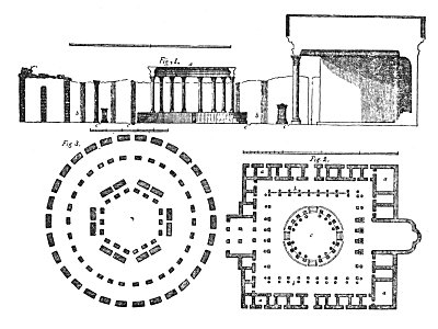temple, but apartments of the priests, places for victims and sacred utensils, and chapels dedicated to subordinate deities introduced by a more complicated and corrupt worship, and probably unknown to the founders of the original edifice. 1 The portico, which runs parallel with these buildings 2 inclosed the temenos, or area of sacred ground, which in the pyræthia of the Persians was circular, but is here quadrangular, as in the Celtic temple in Zeeland, and the Indian pagoda before described. In the centre was the holy of holies, the seat of the god, consisting of a circle of columns raised upon a basement, without roof or walls, in the middle of which was probably the sacred fire, or some other symbol of the deity. 3 The square area in which it stood, was sunk below the natural level of the ground, 4 and, like that of the little Indian pagoda, appears to have been occasionally floated with water, the drains and conduits being still to be seen, 5 as also several fragments of sculpture representing waves, serpents, and various aquatic animals, which once adorned the basement. 6 The Bacchus περικιονιος here worshipped, was,