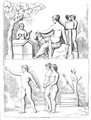 WE are shown by this bas-relief the two principal sides of a sarcophagus, where, without doubt, a married pair were buried: the sculptor has reproduced their features, together with the most important epoch of their life. The first side represents the two, glowing with youth and beauty, at the solemn moment of initiation. They are naked, according to custom, as is also the hierophant; but the latter is free in his movements: he is no longer ashamed of his nudity, for nature lies underneath him, he has knowledge of sacred things, and he reveals them to the young supplicants. But the latter appear abashed and surprised; they listen devoutly to the sacred words of the hierophant, and keep their hands crossed over the place where modesty would require a covering.