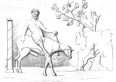 On this bas-relief the animal seems to be neighing, and he even accompanies, with an expressive gesture, an action which among beasts of burden indicates an amorous sensation. The position of his legs sufficiently indicates that he wishes to stop: but his rider makes every effort to compel him to pursue his road; he leans backward, strikes him on the crupper, and raises the bridle. The face of the god is full of expression; his lower