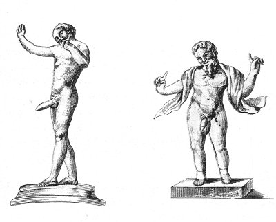GOOD in execution, this little bronze represents one of those buffoons whom the Latins called sanniones. Their occupation was to create laughter with the aid of pantomime. The present one is entirely nude, and displays a phallus of gigantic proportions. His bald and bearded head inclines above his right shoulder. He is making an expressive grimace, and carrying the fore finger of his left hand to his mouth. His other hand is closed, with the exception of the thumb, which is passed between the fore and middle finger. This indecent gesture is still in our own day called "making the fig." The expression is common in early every country of Europe. In England the phrase "don't care a fig" is well known, and Shakespeare speaks of the "Italian Ficco" more than once. Nurses now-a-days may often be seen threatening children with the sign, little thinking of the origin and true meaning of the symbol.