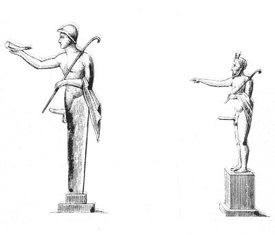No. 1 is a little Hermes bearing the chlamys, the pedum, or pastoral hook the pedum, and the rhyton, the horn of an animal, which the ancients used to drink out of.