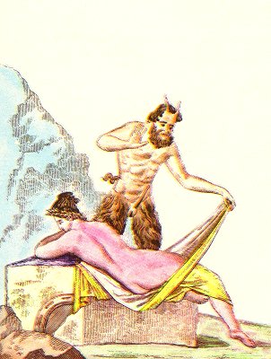 A BACCHANT crowned with ivy has chosen a solitary place to rest herself; but the tambour which we see near her seems to indicate that she wished her retreat to be no secret mystery to the inhabitants of these solitudes. She reclines voluptuously; her beautiful head is artfully turned aside; but her half-shut eyes show that she only feigns to be asleep in order the better to favour the attempts of which she is about to be the object. And indeed one satyr, attracted no doubt by the sound of the music, approaches, and, judging by the apparent slumber of the nymph that the moment is favourable, boldly lifts up the veil which covered her beauty. His lascivious looks, his gaping nostrils, his attitude and gestures, all indicate admiration and desire.