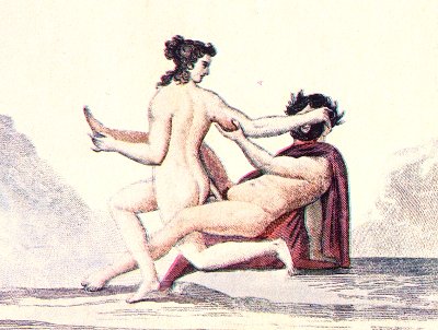 An amorous encounter has sprung up between the god and the nymph: the former slips and falls, but it does not appear his fair companion desires seriously to take advantage of this accident in order to escape the fate which awaits her. It Is evident that she defends herself feebly: her features, her inflamed look, her nakedness, all betray that she is willing to be vanquished. She knows that her own defeat will furnish her with new arms to subjugate and enchain the happy conqueror in his turn.