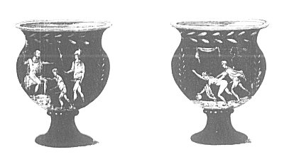 On one side is represented a scene of the Dionysia or Bacchanalia. Three men are taking part in them, each furnished with preposterous phalluses. One of these personages is seated, and represents old Silenus: this is the hierophant, the president of the festival. To the spectator's right is a Bacchus covered with the chlamys, and with his head in a hairy casque. Between these two divinities may be seen a little old man, who draws near the hierophant, places one hand on his thigh, and prepares to worship the attributes of the god.