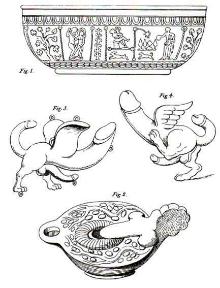 of obscene subjects which are met with among the fine red pottery which is termed Samian ware, found so abundantly in all Roman sites in our island. They represent erotic scenes in every sense of the word, promiscuous intercourse between the sexes, even vices contrary to nature, with figures of Priapus, and phallic emblems. We give as an example one of the less exceptional scenes of this description, copied from a Samian bowl found in Cannon Street, London, in 1828. 14 The lamps, chiefly of earthenware, form another class of objects on which such scenes are frequently portrayed, and to which broadly phallic forms are sometimes given. One of these phallic lamps is here represented, on the same plate with the bowl of Samian ware just described. 15 It is hardly necessary to explain the subject represented by this lamp, which was found in London a few years ago.