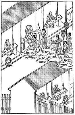 [The accompanying picture illustrates the examination hall where every candidate is seated in a separate cell. The row in the corner is inscribed with the words, "Heaven-Character Number," which means "number one." In explanation we have to state that one way of counting in Chinese is according to the words of the Thousand Character Book, Chien Tzu Wen, which begins with the words Tien ti hsüan huang. This book is used as a primer in Chinese schools, and every partly educated {Chinese} knows it by heart. It contains the thousand most important characters used in daily life and no two characters are alike. Thus, tien (heaven) means "one," ti (earth) means "two," hsüan (dark) means "three," huang (yellow) means "four," etc.]