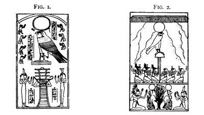 In the vignette which usually accompanies the hymn to the setting sun (Fig. 2), but which does not occur in the present papyrus, a hawk wearing on his head a disk encircled by a serpent, i.e., Ra-Harmachis, {footnote p. 253} takes the place of the disk and (e.g., British Museum papyri Nos. 9901 (Naville, op. cit., Bd. I., Bl. 22,), and 10,472); and the tet is represented by the stand ### (Naville, op. cit., Bd. 1., Bl. 22), on one side of which are three hawk-headed deities, and on the other three jackal-headed deities (see Lanzone, Dizionario, 10, pp. 56, 57.). Beneath are Isis and Nephthys kneeling in adoration before two lion-gods, which represent yesterday and to-morrow. An interesting variant of the latter vignette occurs in British Museum papyrus No. 10,472, which was made for the lady Anhai, a singer in the temple of Amen at Thebes, about B.C. 1000, where, in addition to the apes and figures of the goddesses (the titles of Isis being ### and those of Nephthys ###, there are represented, on each side (I) the winged utchat with pendent uræus and shen ### (emblematic of the sun's circuit) and feather (2) a man, prostrate, adoring the disk; (3) four men, upright, with both hands raised in adoration; and (4) a human-headed bird ###, emblematic of the soul of the deceased lady, standing upon a pylon.]
