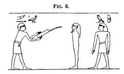 the deceased (Fig. 12) with the instrument ###[1], and the Kher-heb at the same time says: "O Sem priest, lay the pesh-en-kef upon his mouth, and say, 'I have stablished for thee thy two jaw-bones in thy face which was divided into two parts.'" The Sem priest next makes an offering of grapes (Fig. 13), the Kher-heb saying: "O Sem priest, place the grapes upon his mouth and say, 'He bringeth to thee the eye of Horus, he graspeth it; do thou also grasp it.'" After an ostrich feather has been offered (Fig. 14) by the Sem priest, and a number of the ceremonies described above have been repeated, and other animals slaughtered, the Kher-heb addresses the Sem priest, and says: "Take the instrument Tun-tet[2] (thrice) and open the mouth and the eyes" (four times). He then continues: "O Sem priest, take the iron instrument of Anubis, Tun-tet (thrice). Open the mouth and the two eyes (four times), and say, 'I open for thee thy mouth with the iron instrument of Anubis with which he opened the mouths of the gods. Horus openeth the mouth, Horus openeth the mouth,